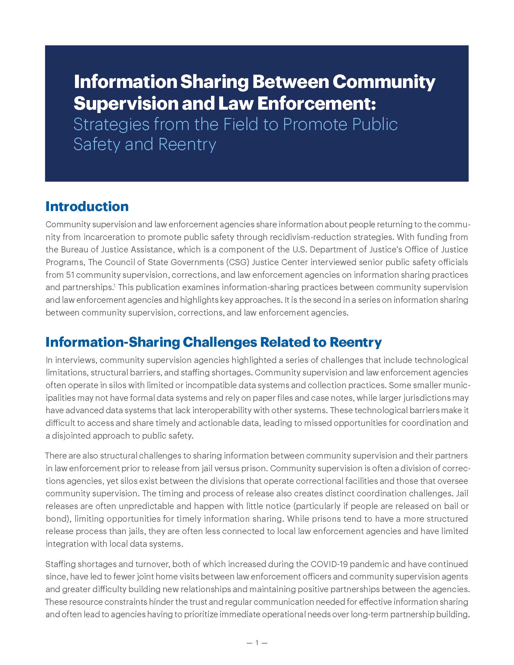 Community supervision and law enforcement agencies share information about people returning to the community from incarceration to promote public safety through recidivism-reduction strategies. This publication examines information-sharing practices between community supervision and law enforcement agencies and highlights key approaches.