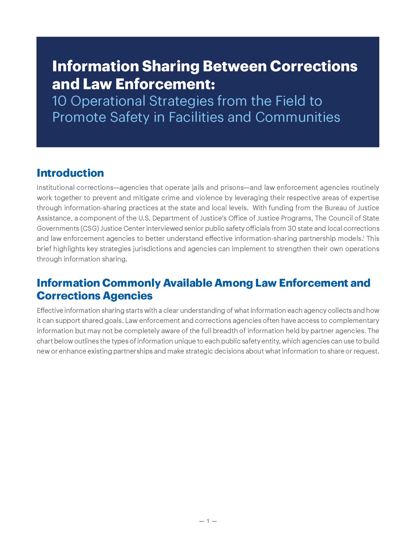 Institutional corrections—agencies that operate jails and prisons—and law enforcement agencies routinely work together to prevent and mitigate crime and violence by leveraging their respective areas of expertise through information-sharing practices at the state and local levels. With funding from the Bureau of Justice Assistance, a component of the U.S. Department of Justice’s Office of Justice Programs, The Council of State Governments (CSG) Justice Center interviewed senior public safety officials from 30 state and local corrections and law enforcement agencies to better understand effective information-sharing partnership models.1 This brief highlights key strategies jurisdictions and agencies can implement to strengthen their own operations through information sharing.